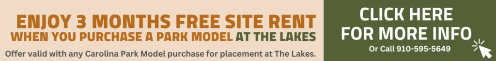 Ask about our current promotion—your first 3 months of site rent are free when you purchase a Carolina Park Model for placement at The Lakes. It’s just one more reason to settle in, stay awhile, and live better by the lake.